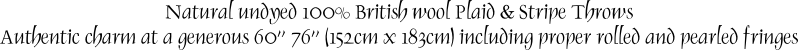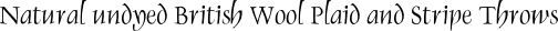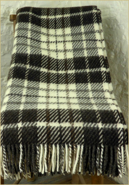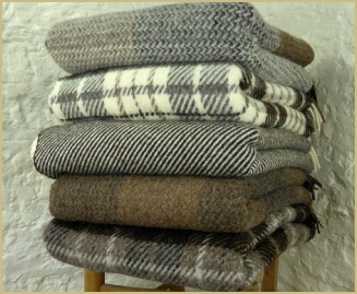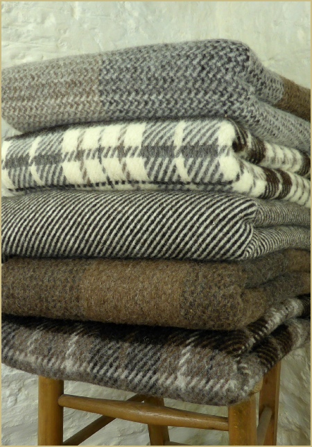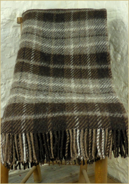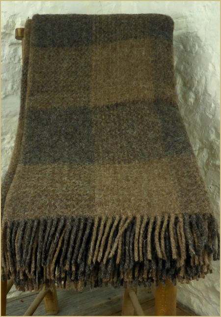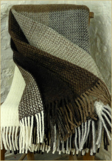 These wonderful throws are woven from from naturally coloured British fleece wool. They therefore contain absolutely no dyestuff, but derive their subtle beauty from the natural colours of the Jacob, Welsh Black and Shetland Moorit sheep from which the wool comes. These throws are finished using natural soap (rather than synthetic detergent.)